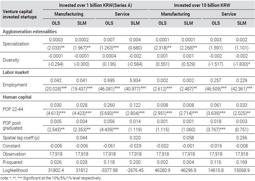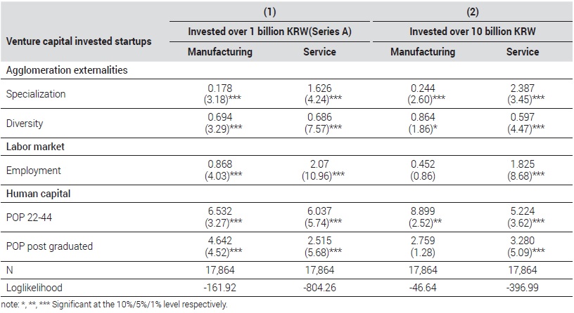 그 외의 기타 설명변수들의 경향 역시 앞서 로짓분석의 결과<Table 4>와 몇 가지 차이를 확인할 수 있다. 총고용인구, 22~44세의 인구는 업종과 투자금액과 상관없이 모두 1%의 유의수준에서 스타트업의 입지와 양(+)의 상관관계를 가지는 것으로 나타났다. 이는 상대적으로 내부 보유자원(설비, 인력, 자본 등)이 부족한 스타트업이 양질의 인적자본에 대한 의존도가 매우 높은 관계로 풍부하고 다양한 노동력을 찾을 수 있는 지역으로 입지함을 유추할 수 있다. 그리고 대학원 졸업인구는 앞의 로짓분석결과와 대조적으로 서비스업 스타트업의 입지와는 상관관계가 나타나지 않았다. 하지만 여전히 투자 초기단계의 제조업에는 양(+)의 효과를 가지는 것으로 나타나 대학원 졸업인구가 많은 지역에 입지하고 있음을 알 수 있다. 이는 서비스업보다 제조업의 기업가정신이 실현되는 데 있어 고학력·고기술 노동자가 더욱 중요하고, 시장진입의 여부를 결정하는 데 더욱 중요한 요인임을 확인할 수 있다.