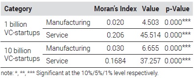 앞서 서울시 스타트업의 공간적 지리적 분포를 분석한 결과 집계구별 스타트업의 수에 공간적 자기상관성이 존재하고 있는 것으로 식별되었다. 따라서 추가적으로 공간적 자기상관성이 존재하는지 통계적으로 검정하였다. 공간적 자기상관성을 검정하는 대표적인 방법으로는 Moran’s I 검정, Lagrange Multiplier(LM) 검정 등이 있다. 본 연구에서는 일반적으로 많이 활용되는 Moran’s I 검정을 수행하였다. Moran’s I 계수는 인접해 있는 공간 단위들의 값을 비교하여 계수를 산출한다. 만일 Moran’s I 통계량이 +1에 가까울수록 유사한 값을 가지는 집계구가 공간적으로 인접해 있으며 반대로 -1에 가까울수록 높은 관측치와 낮은 관측치가 규칙적으로 분포해 있음을 의미한다. 또한 통계량이 0에 가까울수록 공간적 자기상관성이 약하다고 할 수 있다(Anselin, 2003). 분석대상별 Moran’s I 통계량을 산출한 결과는 <Table 5>와 같다. 10억 원 그리고 100억 원 이상의 벤처캐피탈 투자를 받은 스타트업 모두 업종과 상관없이 유의수준 1%(p=0.01)에서 공간적 자기상관성이 관측되었다. 상대적으로 제조업이 10억 원 이상의 투자를 받은 경우는 그 통계량이 0.020, 100억 원 이상의 투자를 받은 경우는 통계량이 0.030으로 각각 서비스업의 0.206과 0.168보다 상대적으로 낮게 나타나 공간적 자기상관성이 적은 것으로 나타났다.