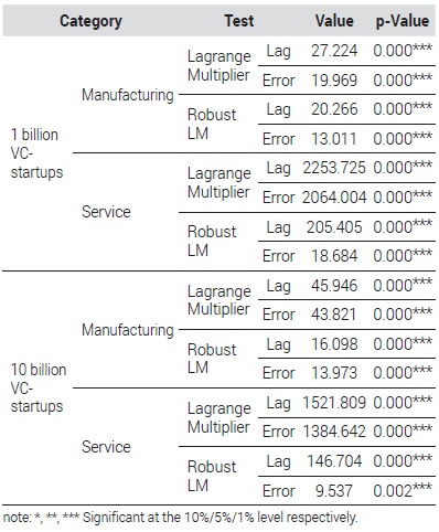 이렇게 각 종속변수의 공간적 자기상관성을 확인하였다면, 일반회귀모형(OLS)의 활용은 적절하지 않으며, 공간시차모형(SLM)과 공간오차모형(SEM) 중에서 적절한 모형을 선택하여 활용해야 한다. 적합한 모형을 판단하기 위하여 Lagrange Multiplier(LM) 통계량을 이용하였다. 하지만 이 경우, 총 4개의 그룹에 대하여 LM-Lag 값과 LM-Error 값이 모두 유의하게 나오므로 Robust LM 검증을 추가적으로 수행해야 한다(Jang and Yi, 2021). 그 결과를 <Table 6>에 표시하였다. Robust LM 통계량 역시 4개 그룹 모두 유의(p=0.01)하였으나, 10억 원 그리고 100억 원 이상의 투자를 받은 제조업 스타트업은 Robust LM-Lag값이 Robust LM-Error 값보다 더 컸다.