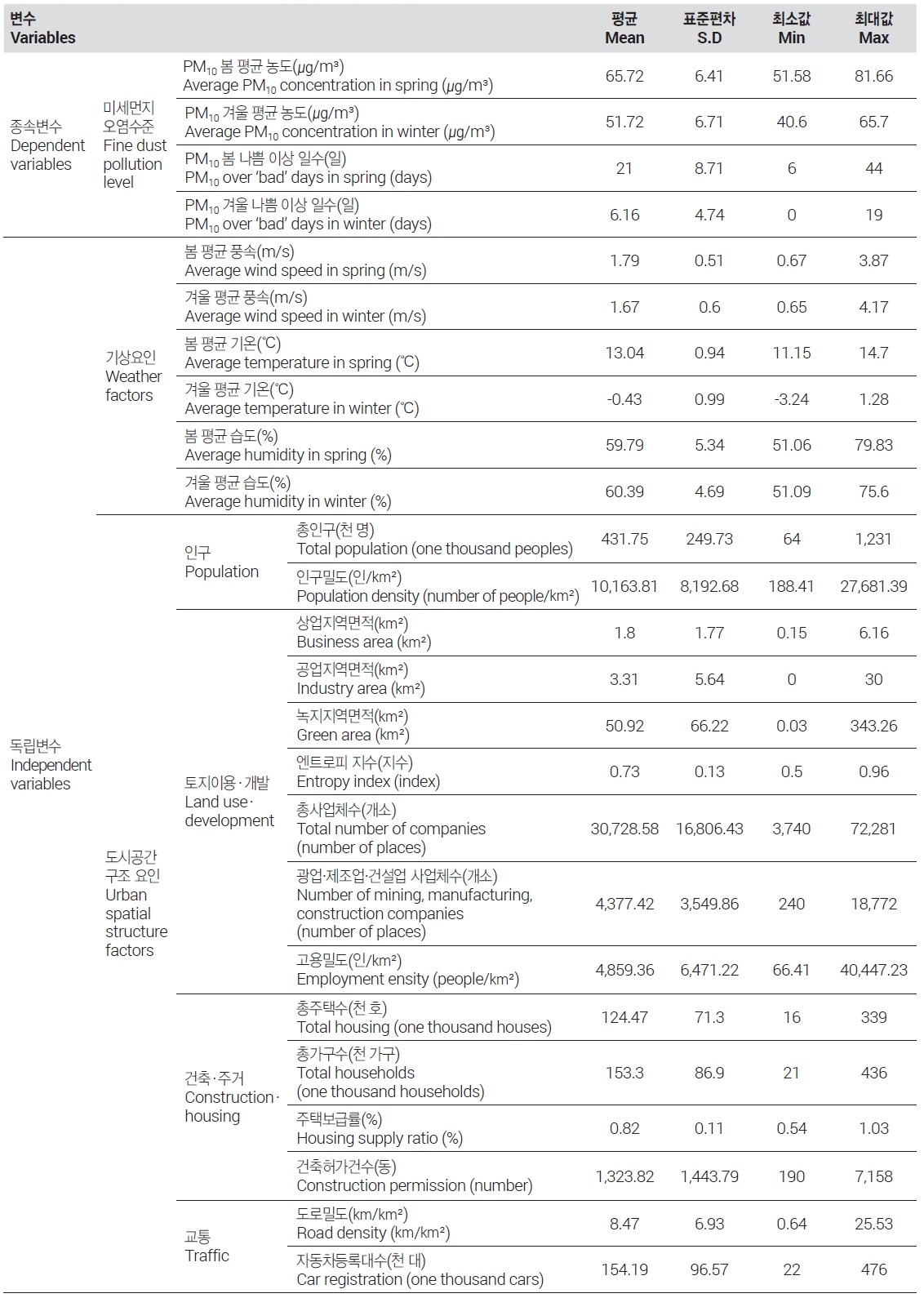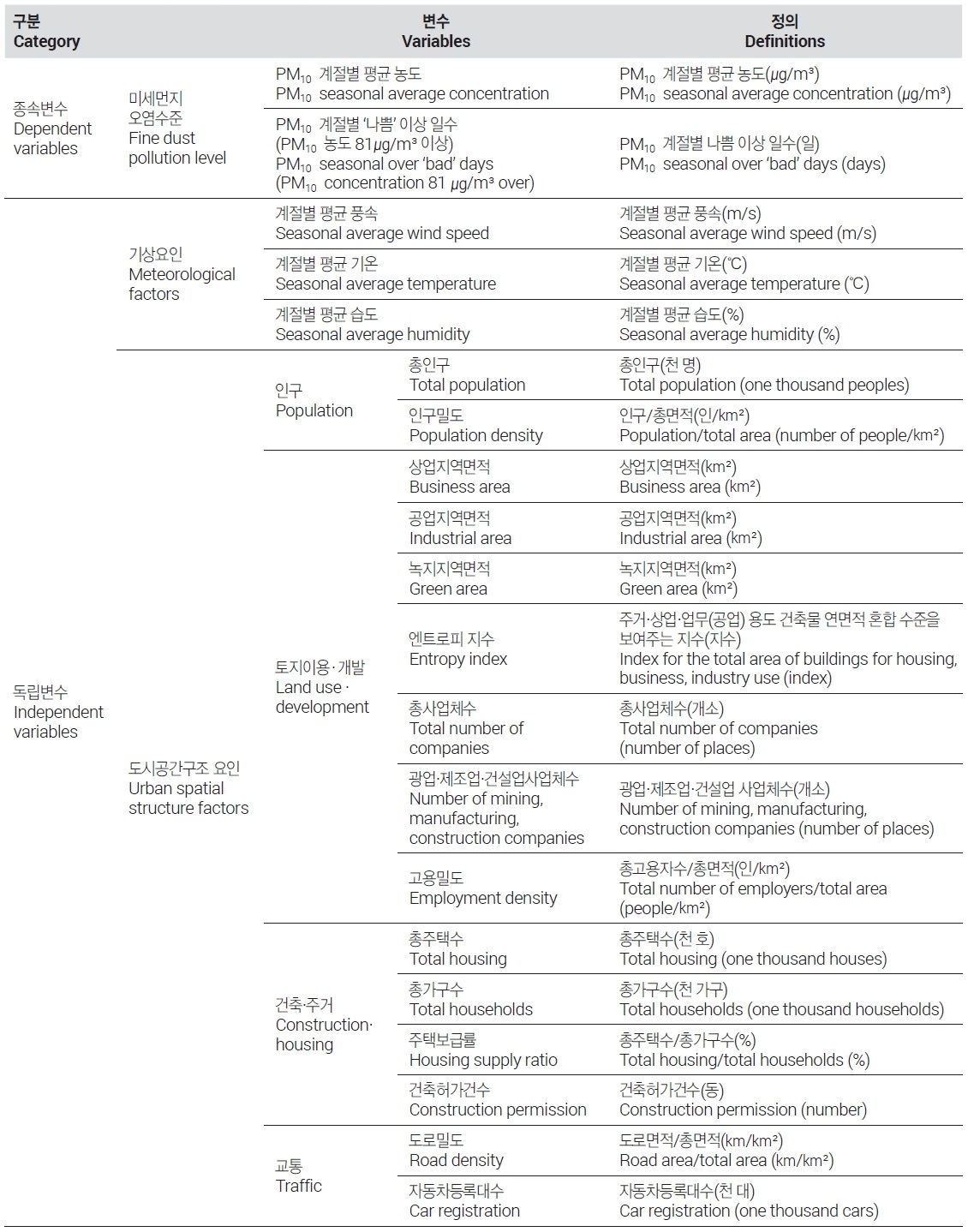 독립변수는 선행연구 검토를 통해 크게 기상요인과 도시공간구조 요인으로 나누어 정리하였다. 미세먼지 농도에 영향을 미칠 수 있는 기상요인으로 풍속, 기온, 습도를 도출하였는데, 이들 기상요인은 종속변수인 미세먼지 오염수준과 마찬가지로 각 계절별 평균값을 사용한다.