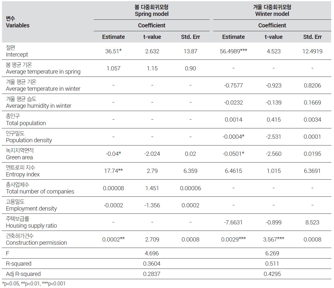 다중회귀모형에서는 우선 계절별로 모든 변수가 전부 포함된 모형을 구축한 후, 다중공선성을 고려하여 단계별로 독립변수를 투입시켜 최종적인 모형을 구축하는 stepwise 방식을 이용해 1차적으로 적합한 모형을 추정하였다. 이 모형을 바탕으로 본 연구의 관심 변수 및 선행연구 검토를 통해 주요하게 살펴보아야 할 변수들을 반영한 새로운 모형들을 구축하고 본 연구에서 활용할 최종적인 모형을 도출하였다.