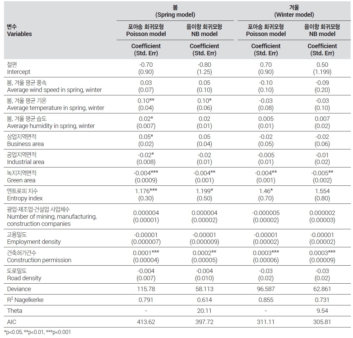 종속변수가 계절별 PM10 나쁨 이상 일수이기 때문에 포아송 회귀모형과 음이항 회귀모형 분석을 각각 4차례에 걸쳐 수행하였다. 다중회귀분석 결과와 마찬가지로 고농도 미세먼지의 계절적 집중을 봄철과 겨울철 모델에서 확인할 수 있으므로, 두 계절에 대한 분석 결과를 중심으로 논의를 진행하였다. 분석에 앞서 분산팽창요인(VIF)을 통해 다중공선성을 살펴보았고, 총인구, 인구밀도, 총사업체수, 총주택수, 총가구수, 주택보급률, 자동차등록대수의 값이 10 이상으로 도출되어 공선성을 확인하였다. 이에 따라 상관관계가 높은 변수들을 확인하여 이들 변수들을 제거한 계절별 포아송 회귀모형과 음이항 회귀모형을 구축하였다.