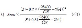 대상지 내에서 발생하는 우수유출량을 계산하기 위하여 대상지의 평균 유출곡선지수(Curve number, CN)를 산정하였다. 토양의 조건에 따라 우수유출량을 산정하는 방식 중 가장 보편적이고 합리적으로 알려져 있어 국내에서 채택하고 있는 미국 자연자원보존국의 SCS-CN 방법을 이용하였다(소방방재청, 2010).