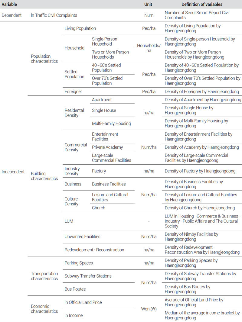 본 연구에서는 도시 특성 요인이 교통 민원에 미치는 영향을 확인하기 위해 변수들을 다음과 같이 설정하여 분석을 진행하였다. 모든 변수에는 면적당 밀도 개념을 적용하였다.
