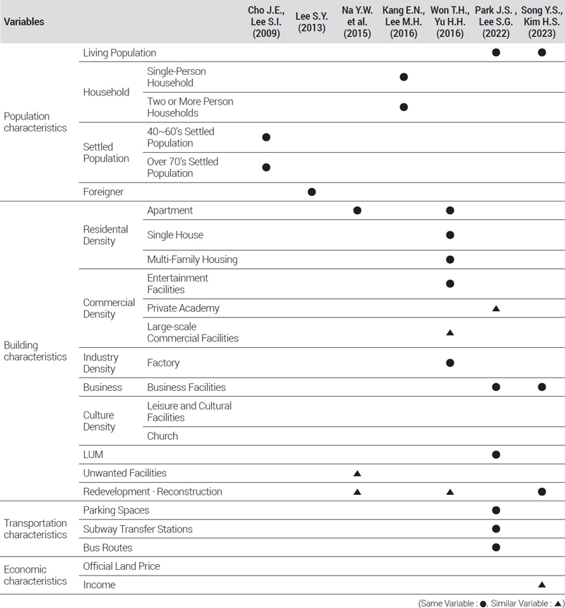 학원 변수는 입시학원 밀집지역 인근에서 다양한 민원이 발생한다는 최현주·최관(2017)의 연구결과를 참고하여 변수로 선정하였다. 재건축·재개발 지역은 덤프트럭과 믹서트럭, 포클레인 등과 같은 공사 차량의 진출입으로 인해 교통 환경이 악화되며 이들 차량이 공사장 인근 도로에 불법 주정차를 하는 경우가 있다는 점을 고려하여 변수로 선정하였다.