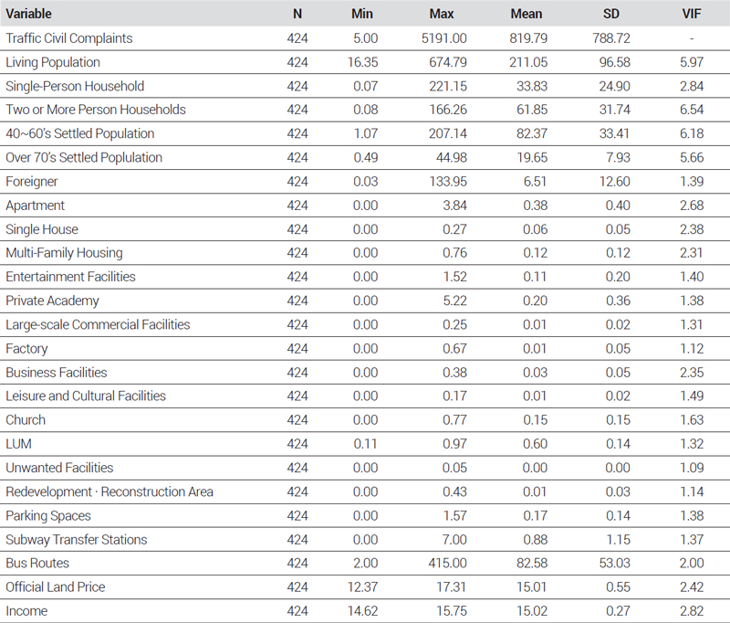 <Table 1>은 사용된 변수들의 정의를 정리한 것으로, 독립변수는 인구 특성, 건물 특성, 교통 특성, 경제 특성으로 나눠 설정하였다. 또한, 민원 관련 연구들을 참고하여 변수로 선정하였다(<Table 2> 참조).