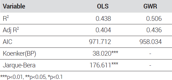 지리가중회귀모형(GWR)을 진행하기에 앞서 OLS모형의 통계적 기본가정 준수 여부와 함께 OLS모형 및 GWR모형의 AIC 값의 비교를 통하여 모형의 적합성을 판단해야 된다(정기성·홍사흠, 2019). 이를 위해 오차의 정규성, 등분산성, 공간적 자기상관성을 검토하였다. 오차의 정규성은 Jarque-Bera 값을 통해 확인할 수 있는데, 유의할 경우 잔차의 분포가 오차의 정규성 가정을 따르지 않는 것이며, Koenker-Bassett와 Breusch-Pagan 통계 값이 유의할 경우 종속변수와 독립변수 간의 공간적 관계에 따라 달라지는 지역적 이질성을 가지고 있는 것을 뜻한다(정기성·홍사흠, 2019). 지역적 이질성이 존재하는 경우 OLS모형이 아닌 GWR모형을 사용하는 것이 적절하다(이희연·심재헌, 2011).