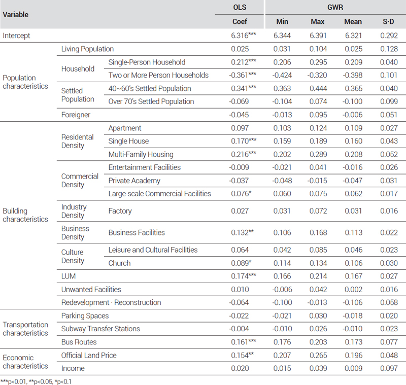 GWR모형의 적합성을 판단하기 위하여 OLS모형과의 AIC(Akaike Information Criterion) 값 등을 비교하였다. 검증결과 Jarque-Bera와 Koenker(Breusch-Pagan) 값은 99% 유의수준에서 유의미하게 나타났다. 이는 OLS모형이 오차의 정규성 가정을 위배하며, 오차의 등분산성을 위배하여 지역적 이질성이 존재하는 것을 뜻한다. 또한, 설명계수(R-squared)의 경우 OLS는 0.438이었지만 GWR모형에서는 0.506으로 상승한 것을 확인할 수 있다. AIC에 있어서도 OLS와 GWR을 비교해보면 971.712에서 958.034로 OLS보다 GWR이 더 적합한 모형인 것을 확인할 수 있다(<Table 4> 참조). 따라서, GWR모형을 사용하여 분석을 진행하였다. 본 연구에서는 OLS모형에서 유의하게 도출된 변수만을 대상으로 GWR모형에 대한 해석을 진행하였다.