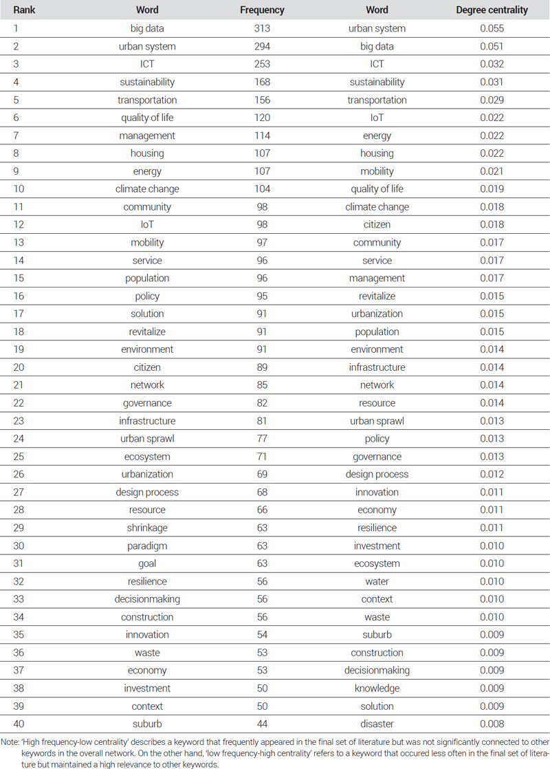 A total of 3,822 keywords with more than one occurrence were derived from the frequency analysis of 264 literature sources. <Table 1> shows the frequency and degree centrality analysis results of the top 40 keywords related to the SC discourse for shrinking cities.
