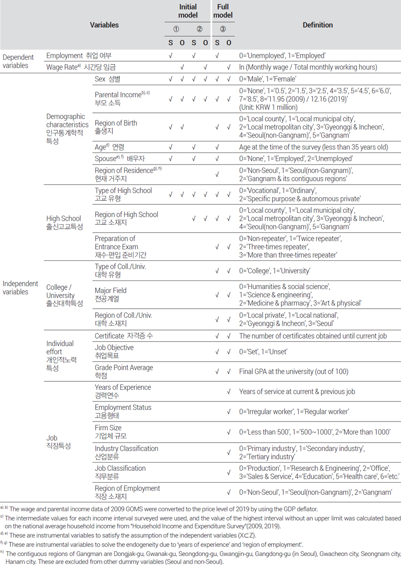 또한 첫 번째 분석에서의 헤크만 표본선택모형은 단계적인 변수 투입 방법을 취할 것이다. 처음에는 성장기 거주지역, 인구통계학적 특성을 비롯하여 대학 진학 이전까지의 특성을 나타내는 변수만을 모형에 투입하도록 한다(초기모형). 이를 통해 성장기 거주지의 지역적인 중심성이 클수록 노동시장에서 높은 성과를 얻는 경향이 있는지 분석할 것이며, 특히 출생지로 대표되는 유년기와 출신 고등학교의 소재지로 대표되는 청소년기 중에서 어느 시기의 거주지역이 향후 성과에서 더 중요한 요인인지 확인할 것이다(모형 ①, ②). 이후에는 대학과 직장에 관한 변수들까지 모형에 넣어 통제함으로써 성장기 거주지역이 이후의 생애주기와 긴밀한 관련을 갖고 임금에 영향을 미친다는 사실을 규명할 것이다(전체모형, 모형 ③). 다만 모형 ③의 경우, 직장에 관한 특성 중 일부 변수가 임금을 결정하는 2단계 모형에서 내생성을 야기할 우려가 있으므로 도구변수 추정법을 활용할 필요가 있다. 이에, 내생성을 야기하는 변수에 대한 도구변수를 선정하고, Wooldridge(2010)의 제안에 따라서 선택모형인 프로빗 모형에서는 모든 외생변수와 도구변수를 투입하여 IMR을 추정한 뒤 결과모형에서는 이 IMR까지 통제변수로 포함하는 2SLS(two-stage least squares) 모형을 실행할 것이다.