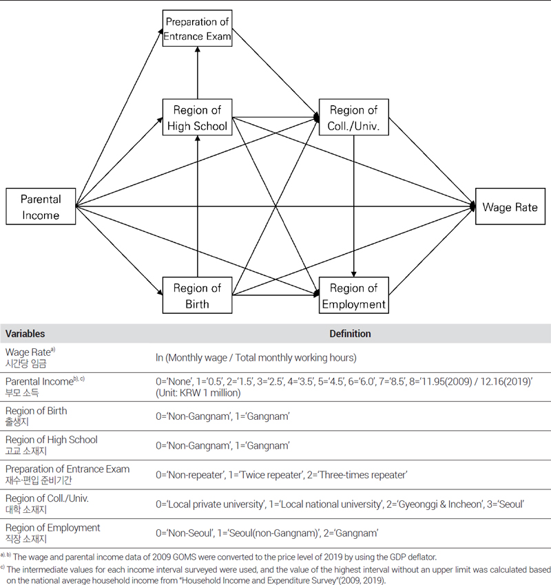 우선, 출생지와 고교 소재지는 성장기 거주지역을 의미하는 핵심 변수이며, 지역적 중심성에 따라서 강남, 서울(강남 외), 경기·인천, 비수도권 광역시, 비수도권 일반시, 비수도권 군의 범주로 구성된다. 성장기 이후의 생애주기가 영위되는 지역으로서 대학 소재지와 직장 소재지도 지역적 중심성에 따라 값을 부여하였다. 대학 소재지의 경우, 지역대학 간에도 대학 운영주체(국립, 사립)에 따라 입학경쟁이 상이하다는 점을 감안하여 서울, 경기·인천, 지역국립대, 지역사립대로 범주를 구분하였고, 직장 소재지는 강남, 서울(강남 외), 비서울로 구분하였다. 부모 소득은 부모 세대의 계층성으로서 세대 간 부의 재생산 효과를 확인하기 위한 변수이다. GOMS에서 부모 소득에 관한 문항은 응답자의 대학 입학 시점을 기준으로 월평균 소득을 질의하고 있는데, 본 연구에서는 그 값을 응답자의 성장기와 연속성이 있는 외생 변수로 가정하였다. 재수·편입 준비기간은 성장기 거주지역의 교육열이라는 지역민들의 아비투스를 의미하는 지표이자 대학 진학이라는 향후 성과에 직접적인 영향을 미칠 수 있는 요인이며 준비기간에 따라 현역, 재수, 삼수, 사수 이상으로 범주화하였다.