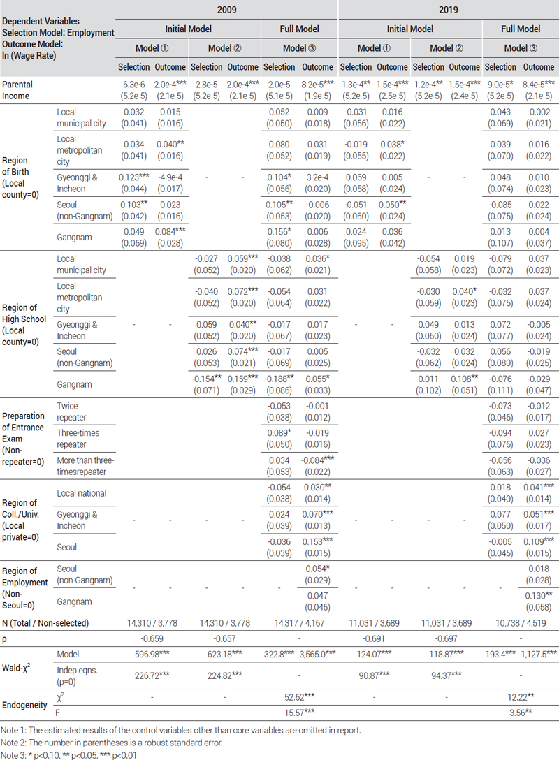분석 결과는 <표 3>과 같다. 분석의 핵심적인 요지를 간결하게 전달하기 위하여, 본 분석의 핵심 설명변수(부모소득, 지역 관련 변수, 재수·편입 준비기간)들의 추정 결과만을 보고하고, 나머지 통제변수들은 보고에서 생략하였다. 우선 헤크만 표본선택모형의 전체적인 적합도를 나타내는 Wald-χ2 값은 연도와 관계없이 모든 모형이 유의수준 1%에서 유의하였다. 표본선택편의 존재 여부와 헤크만 표본선택모형의 필요성을 판단하기 위해서는 선택모형의 잔차와 결과모형의 잔차 간 상관계수인 ρ의 값을 살펴야 한다. 모형 ①과 ②에서 도출된 ρ의 절대값이 0.6을 상회하고, ρ=0이라는 귀무가설 또한 Wald 검정이 기각시키므로 헤크만 표본선택모형을 사용하는 것이 OLS 모형을 사용하는 것보다 적절하다. 임금과 직장변수 간의 내생성을 우려하여 도구변수를 투입한 모형 ③에서도 내생성 검정(χ2, F 검정)을 통해 실제로 변수의 내생성이 존재하였음을 확인하였다.