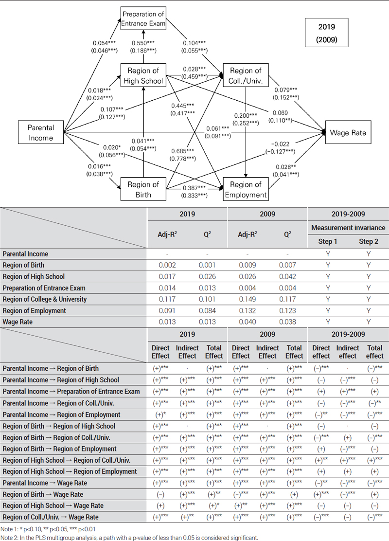 두 번째 분석에서는 경제활동 중인 표본들만을 대상으로 성장기 거주지역이 향후의 생애주기에서 어떤 지역적인 매개효과를 통해 임금에 영향을 미치는지 확인하기 위한 PLS 경로분석(PLS path analysis)을 실행한다. 종래에 많이 사용되던 공분산 기반(covariance based)의 경로분석은 다변량 정규성이라는 데이터의 엄격한 분포를 가정하는데, 본 분석의 경로를 구성하는 지역 관련 변수들은 범주형 변수로서 정규성을 충족시키기 어려우므로 데이터의 분포를 가정하지 않는 비모수적 기법으로서 부분제곱법(partial least squares)을 활용하는 PLS 경로분석이 더 적절하다. 이 분석에서는 지역적인 중심성이 큰 지역에서 성장한 사람들이 대학·직장 등 향후의 생애주기도 중심부 지역에서 영위하게 되는 경로의존성을 갖는지 확인하고 이것이 세대 간 부의 재생산 기제로서 작용한다는 사실을 규명할 것이다. 또한 2009년과 2019년간의 다중집단분석을 실행함으로써 모형의 경로가 지난 10년간 어떻게 변화하였는지 확인하도록 한다.