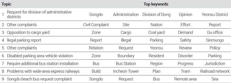 Topic 1 revolves around civil complaints concerning the division of Songdo 4-dong and 5-dong, as revealed through keywords such as “Songdo”, “administration”, and “division of Dong”. During the process of dividing Songdo 4-dong, with over 50,000 inhabitants, into 4-dong and 5-dong, there was a dispute between residents and Yeonsu District when a newly proposed plan conflicted with the existing administrative district plan.