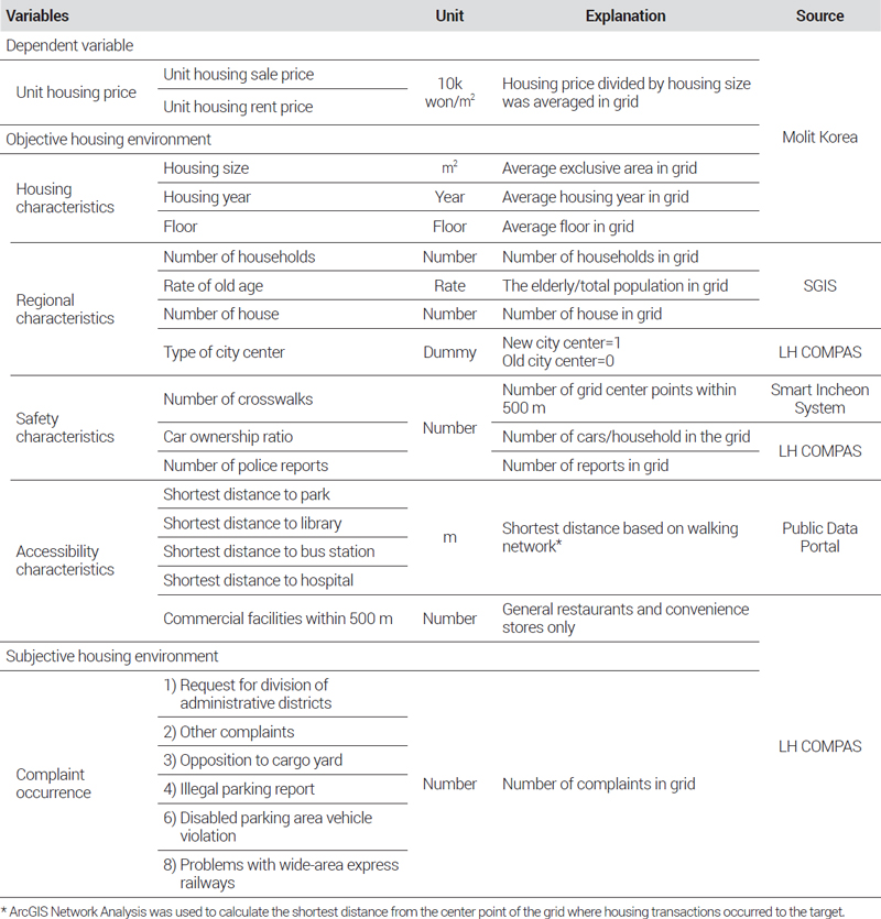 To achieve the research objectives, this study aims to analyze the impact of subjective residential environment characteristics based on civil complaints data and objective residential environment characteristics on housing prices in Incheon’s Yeonsu District in 2020. Housing prices were categorized into sale prices and rental prices, utilizing real transaction data provided by the Ministry of Land, Infrastructure, and Transport.
