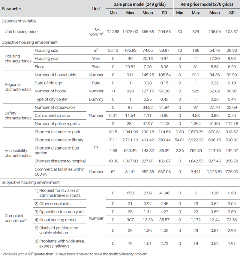 The multiple regression model was categorized into sale and rent models based on the dependent variables, and before conducting the analysis, descriptive statistics were performed for each model (see <Table 3>).