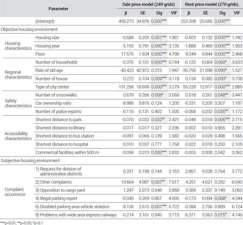 In this study, a multiple regression model with 21 independent variables was constructed to explain the dependent variable (average transaction price of housing per unit area). Multiple regression analysis, commonly used in economic and social science analyses, offers the advantage of accurately assessing the effect of individual independent variables by controlling for the influences of other variables (Park and Han, 2015). Furthermore, the analysis was conducted for both sale prices and monthly rent prices. Rental prices reflect the demand for housing services, representing the use value. Sale prices, on the other hand, encompass both use and investment values, acting as a composite indicator that reflects both aspects (Sung and Park, 2014). Therefore, in this study, the aim is to explore how subjective residential environment factors based on civil complaints data and objective residential environment factors affect both rent and sale prices.