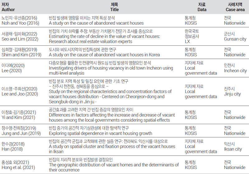 전국 단위의 빈집 발생에 대한 연구는 거시적인 관점에서 발생 추세나 위치를 관찰할 수 있다. 그러나 지역의 공간적 특성에 따른 영향 요인을 파악하기 어려운 한계가 존재하며, 이는 대상 지역에서 다양한 공간적 범위의 연구가 필요함을 의미한다. 사례지역적 측면에서 높은 빈집 비율을 보이는 지방 도시를 대상으로 한 연구는 활발히 이루어졌다(이종수·김선덕, 2021; 이희옥·임종환, 2018; 장명준·권성문, 2021; 전영미·김세훈, 2016). 반면, 서울시를 대상으로 진행된 연구(이승구, 2022)나 빈집의 가치 및 활용 방안 연구(장윤배·조하영, 2019)는 일부 존재하지만 미시적인 공간 단위의 연구는 다소 부족한 실정이다. 또한, 대부분의 연구는 분석 자료의 특성으로 인해 공간적 분석이 시군구 단위의 거시적인 수준에서 이루어졌다. 이로 인하여 빈집 발생의 영향요인 도출에 구체적인 지역 특성을 반영하기 어렵다는 한계를 갖는다. 그리고 빈집 발생의 영향요인으로 인구·사회학적인 측면, 경제적인 측면과 더불어 관련 제도 및 법규가 작동하는 구조적인 요인을 고려한 연구 역시 비교적 이루어지지 않았다.