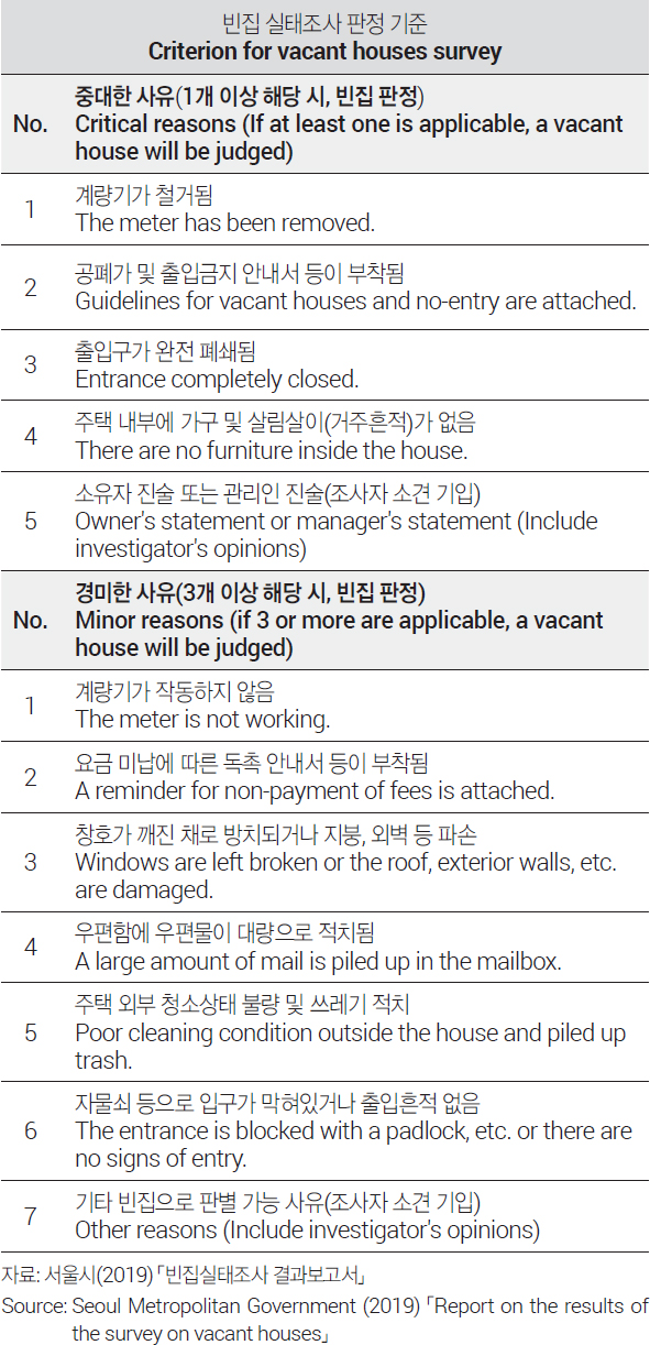 빈집에 대한 주요 연구에서 사용된 자료는 통계청의 인구주택총조사 기반 행정자료인 경우가 많다(노민지·유선종, 2016; 심희철·김재환, 2019; 이창효·김기중, 2021; 홍성효 외, 2021). 2022년 기준 통계청 인구주택총조사 자료 기준 전국 빈집은 139만 가구로 집계되었다. 한편, 각 지방자치단체가 조사하고 국토교통부에서 발표하는 빈집 실태조사의 경우 빈집의 수는 전국 10만 가구이다. 이러한 차이가 나타나는 이유는 통계청 자료의 경우 조사일 기준 비어있는 집이면 빈집으로 판정하는 반면, 빈집 실태조사의 경우 전기, 상수도 사용량을 바탕으로 조사하기 때문이다. 따라서 통계청 자료의 경우 부정적인 영향을 미치는 방치된 빈집뿐만 아니라 일시적인 빈집 또한 포함되므로, 빈집의 수를 과다 추정할 수도 있다. 이러한 현황은 연구 목적에 맞는 조사자료를 활용해야 함을 시사한다. 이와 함께, 빈집의 발생은 인구감소, 고령화로 인한 측면과 더불어 빈집 소유주의 자의적 방치라는 점에서 시사하는 바가 더욱 크다. 따라서 인구 사회학적, 물리적 환경 요인과 더불어 경제적 요인을 고려하고, 방치를 유발하는 제도적 한계를 고찰하여 실효성 있는 정책 도출이 필요하다.