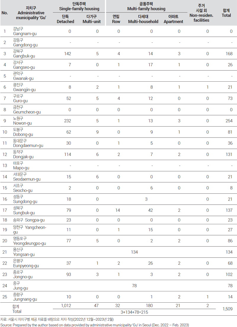 서울시 25개 자치구 중 강동구, 관악구, 마포구의 경우 「공공기관 정보공개에 관한 법률」 11조에 따른 정보를 접수·생산하지 않은 경우나, 「공공기관 정보공개에 관한 법률」 9조에 따른 비공개 정보대상에 해당함을 사유로 자료가 제공되지 않았다. 구로구, 성북구, 중구는 「빈집 및 소규모주택 정비에 관한 특례법」 15조 6항에 따라 빈집의 소유주가 동의한 경우에만 소재지를 제공한다. 그 외의 경우에는 법정동이나 행정동 수준에서 빈집의 개수만 제공되어 본 연구의 분석단위인 집계구 단위에서 활용하는 데 어려움이 있었다. 위 6개 자치구를 제외한 다른 자치구에서는 빈집 소재지를 전부 혹은 일부 공개하였고, 강남구와 금천구는 실태조사 이후 빈집을 대부분 정비하여 빈집이 행정상으로는 존재하지 않았다. 또한, 현재 철거 중이거나 안전조치 명령이 이루어진 서초구와 송파구의 자료는 연구 대상에서 제외하였다. 이러한 이유로 10개 자치구가 제외되었고, 최종적으로 통계적 분석과 익명화를 위해 15개 자치구의 1,190개 빈집 소재지에 대하여 집계구 단위로 빈집 자료를 구축하였다.