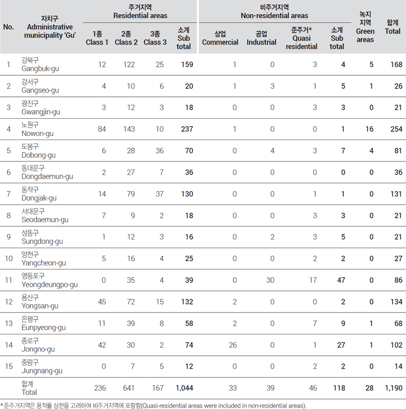 서울시는 2018년 한국감정원(현재 한국부동산원)과 서울시 빈집정보시스템 구축 업무 협약을 맺고 빈집 실태조사를 시행하였다. 이때 빈집 유형을 주택 유형별, 용도지역별, 대지면적별, 접도조건별, 필지형태별, 고저별, 건물구조별, 지붕구조별, 건축연수별, 소유구분별로 나누어 여러 분류로 조사하였다. 사전 조사 시 16,529개의 물량에서 현장조사 등의 과정을 거쳐 2019년 서울시의 빈집 수는 2,972개로 집계되었다. 그러나 2023년까지 정비가 이루어져 현황이 많이 변화되었을 것이라는 점, 자치구 수준에서 빈집의 개수만 제공되는 점, 빈집의 소재지를 알 수 없어 미시적인 분석단위로 집계할 수 없는 점으로 인해 본 연구에서 활용이 어려웠다. 따라서 정확한 빈집의 위치를 파악하고 분석 결과의 신뢰성을 확보하기 위해 서울시 각 자치구에서 추가적으로 조사한 빈집 실태조사 자료를 활용하였다. 자료를 구득하기 위해 각 자치구의 건축과, 도시과, 주택과 등 관련부서에 정보공개를 요청하거나 직접 방문하였다. 담당 주무관과 자료가 필요한 사유와 공개범위 등을 논의하였고, 이러한 과정을 거쳐 소재지가 파악된 서울시 자치구별 빈집의 수는 <표 3>과 같다. 그리고 연구 대상 지역인 15개 자치구의 용도지역별 빈집 현황은 <표 4>와 같다.