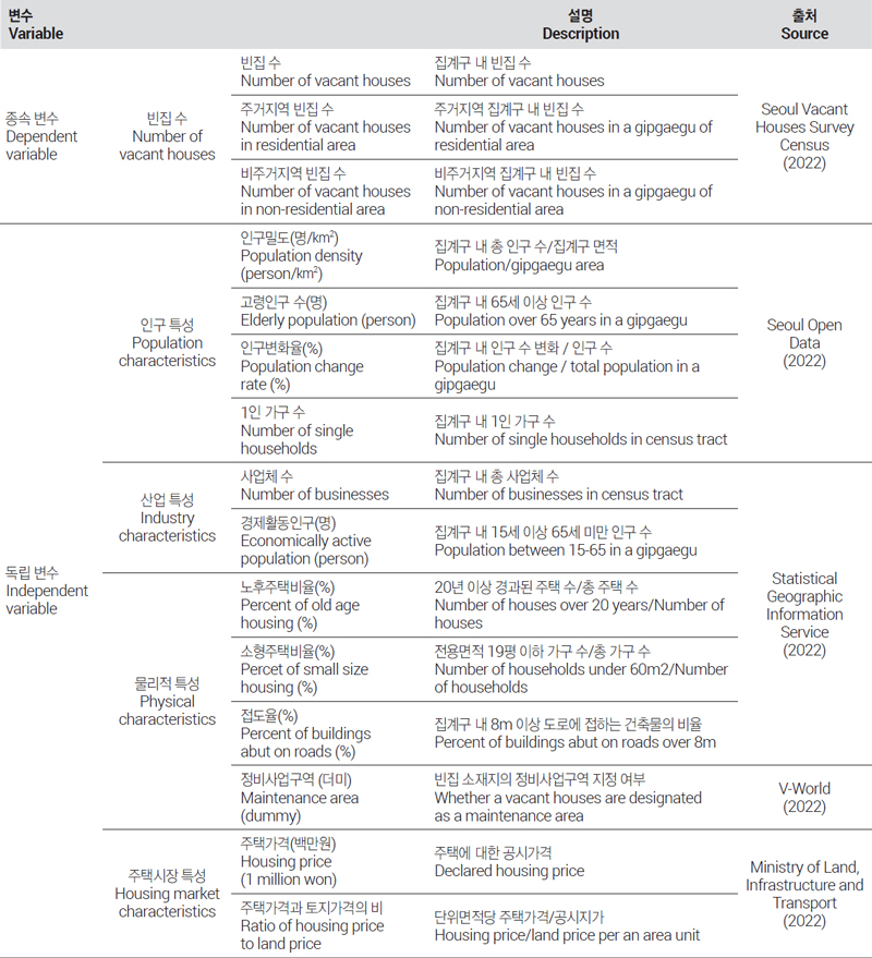 선행연구 고찰을 통한 본 연구의 차별성은 다음과 같다. 첫째, 분석의 정확도를 높이기 위해 행정자료 기반의 통계자료가 아닌, 서울시 각 자치구로부터 구득한 빈집 실태조사 자료를 활용하여 빈집의 정확한 위치자료를 구축하였다. 둘째, 기초단위구를 기반으로 인구 규모, 사회경제적 동질성, 집계구 형상을 고려하여 구축한 최소 통계 집계구역인 집계구를 분석 단위로 설정하여 연구의 구체성을 확보하였다. 셋째, 빈집 발생에 영향을 미치는 요인으로 인구·통계학적 특성, 물리적 환경 특성뿐만 아니라 토지와 가격의 정책적 특성을 반영하여 분석을 진행하였다. 마지막으로, 주택 수요가 여전히 높은 서울시를 연구 대상으로 선정하고 미시적 공간단위에서 빈집 발생의 공간적 분포특성과 영향요인을 분석하고 정책적 시사점을 제시하였다.