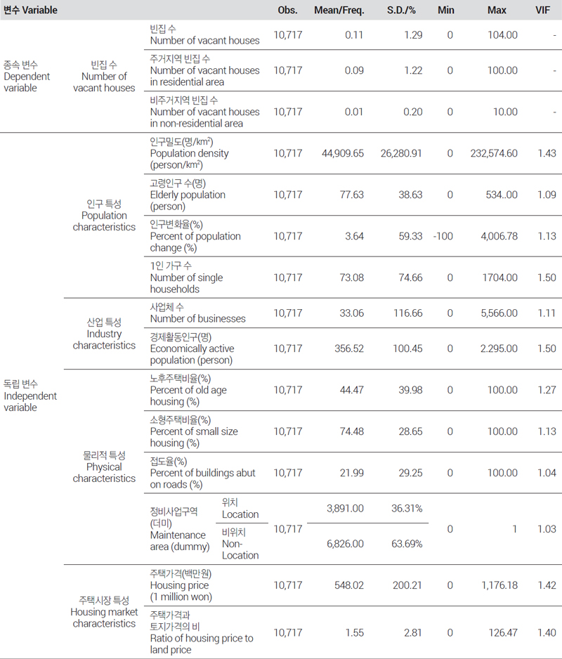 정비사업구역은 더미변수이므로 빈도분석으로 평균과 표준편차 대신 빈도수와 비율 값을 산출하였고, 정비사업구역이 존재하는 집계구는 3,891개, 36.31%로 나타났다. 그리고 주택시장 특성 변수로 주택가격과 토지가격의 비를 변수로 활용하여 주택가격과 주택가격의 관계가 어떻게 빈집 발생에 영향을 미치는지 분석하였다.