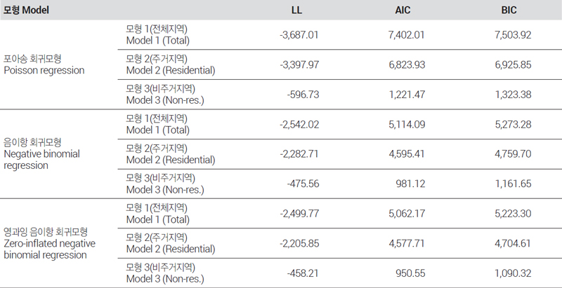 <표 7>은 모형의 적합도 분석 결과이다. 연구의 목적에 맞는 분석을 위해 빈집의 수를 집계구 단위로 산정하였다. 그리고 분석 모형을 연구 대상지역의 전체 빈집의 수가 종속변수인 모형(모형 1), 주거지역에 위치한 빈집의 수가 종속변수인 모형(모형 2), 주거지역이 아닌 곳에 위치한 빈집의 수가 종속변수인 모형(모형 3)으로 분류하였다. 또한, 통계적으로 가장 적합한 모형을 검증하기 위하여 Log Likelihood(LL), Akaike Information Criterion(AIC), Baysian Information Criterion(BIC) 값을 비교하였다.