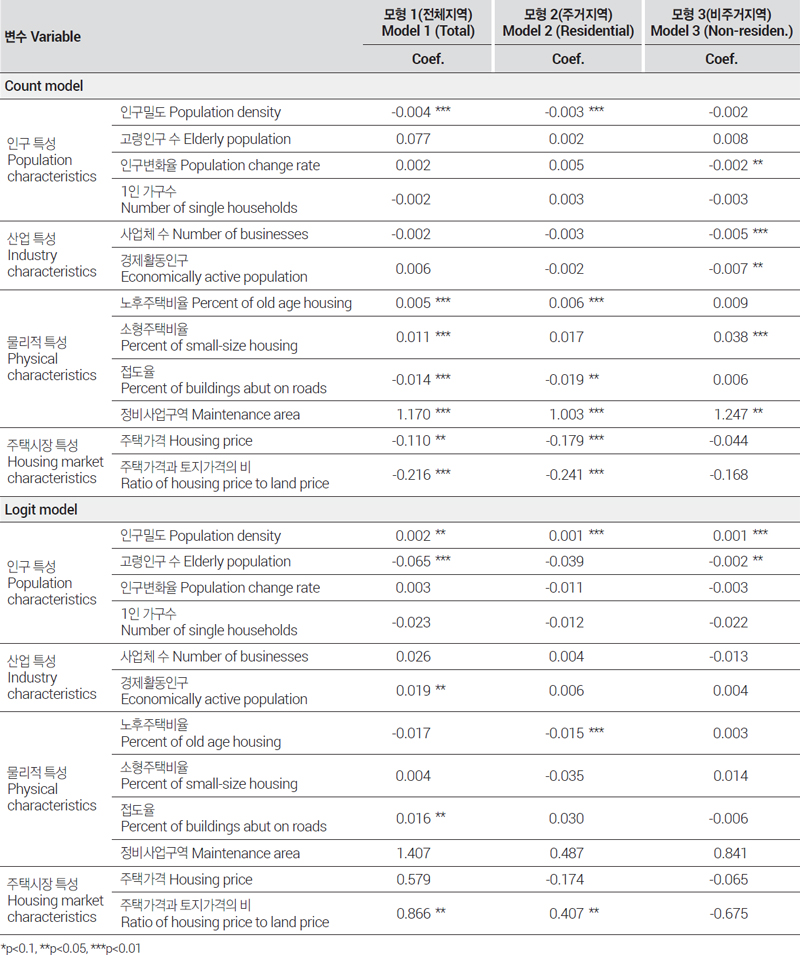 본 연구에서는 빈집 자료의 특성을 고려하여 영과잉 음이항 회귀모형을 활용하였다. 영과잉 음이항 회귀모형은 종속변수를 두 개의 집단으로 나누어 추정하는데, 한 집단은 0이 아닌 종속변수에 대한 환경요인을 분석하는 Count 모형과 다른 한 집단은 0인 종속변수에 대한 환경요인을 분석하는 Logit 모형으로 구성된다. 따라서 Count 모형에 대한 결과는 0이 아닌 종속변수에 대한 독립변수의 영향을 분석하는 것으로 빈집의 수와 관련된 환경요인에 대한 추정이다. 그리고 Logit 모형에 대한 결과는 0인 종속변수가 0에 속할 확률에 대한 분석이다. 따라서 Logit 모형은 빈집의 무발생확률에 대한 분석이므로 빈집이 발생하지 않은 집단에 대한 환경요인을 추정하는 것이다.