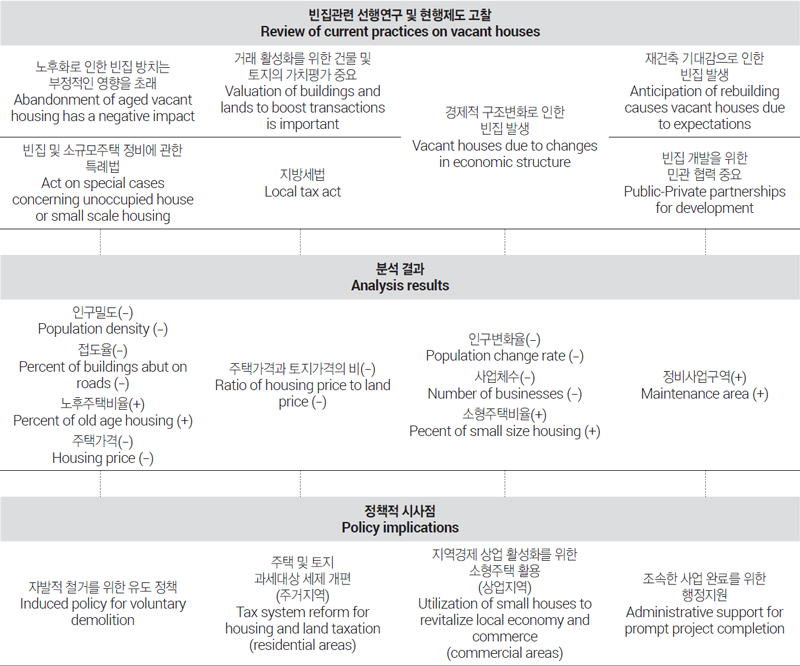 이와 같은 분석결과는 서울시의 경우 국지적으로 지방도시와 같이 도시 쇠퇴현상이 일어나는 지역에서 빈집이 발생하기도 하지만, 빈집 발생 요인은 주거지역과 비주거지역 등 해당 지역의 특성에 따라 다르는 것을 의미한다. 또한, 가격 변수를 통해 제도적 요인이 영향을 미치고 있음을 알 수 있다. 그러므로 빈집 발생에 대한 영향요인을 파악하고 문제를 개선하기 위해 주택 소유주 개인과 더불어 정부, 지역사회가 협력하는 정책의 구현이 필요함을 시사한다.