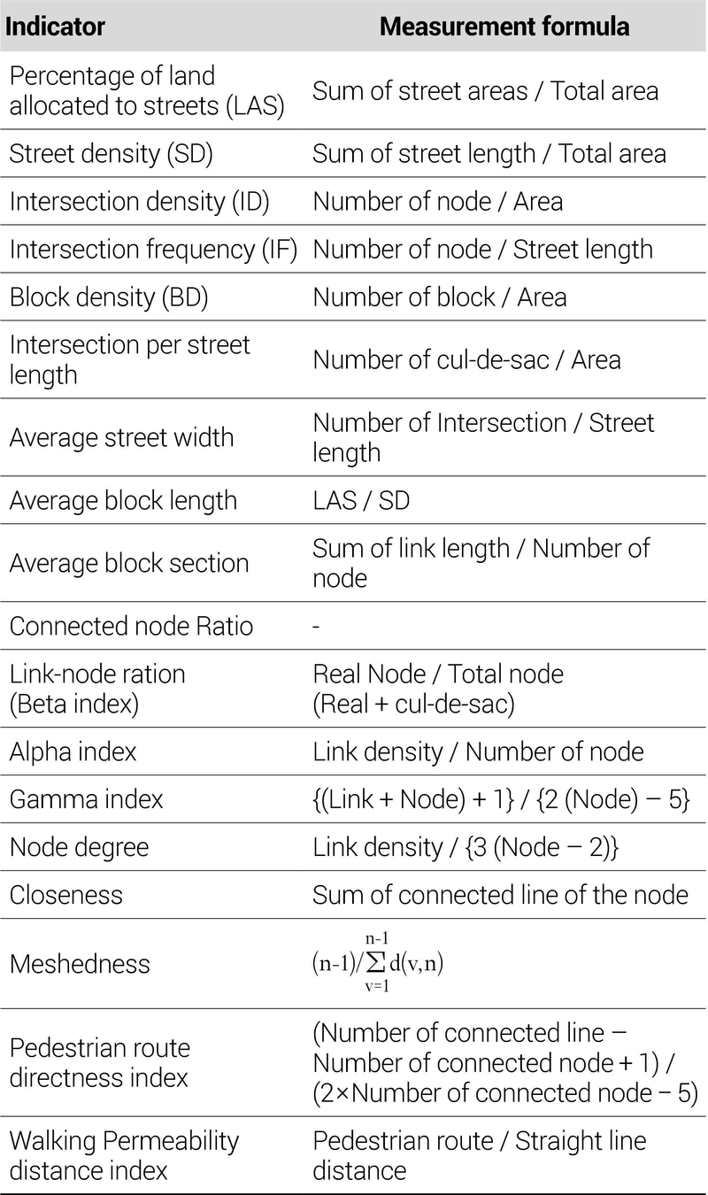 연결성 측정을 위하여 사용되고 있는 다양한 지표들을 정리하면 <Table 1>과 같다. 인간적 척도를 포함하기 위한 지표에는 가로면적율, 가로밀도, 교차점밀도, 교차로 빈도, 블록 밀도, 막다른 도로 밀도, 가로 길이당 교차로 수, 평균 가로 폭, 평균 블록 길이, 평균 블록 섹션이 있다. 위상학의 노드를 중심으로 한 측정 지표에는 연결된 노드 비율, 링크 노드 비율, 노드 수준이 있고, 개별 지점의 접근성 중심의 지표에는 가까움, 그물망 지표가 있으며, 교통지리학적 관점에서 시작된 주요 지표에는 알파·베타·감마 지수가 있다. 마지막으로 보행성 평가 연구 시 주로 사용되는 가로 접근성 측면의 지표에는 보행자도로 직접성 지수, 도보 투과성 거리 지수가 있다.