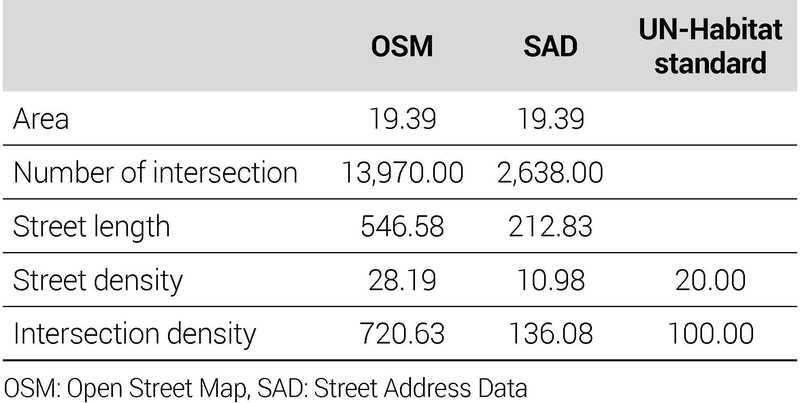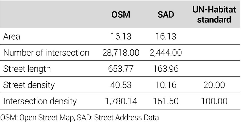 UN-Habitat(2012)는 가로연결성 측정을 위해 3개의 지표를 제안하였다. 가로면적율(Land Allocated to Street, LAS)은 시가지 면적 중 가로 면적의 비율로서 공공공간으로서의 가로의 비중을 나타내고, 가로밀도(Street Density, SD)는 시가지 면적 대비 총 가로 길이의 비로서 가로 밀도가 높다는 것은 목적지까지 짧고 직접적인 경로의 가능성이 높음을 의미하며, 교차점밀도(Intersection Density, ID)는 시가지 면적 대비 총교차점 수의 비로서 교차점 밀도가 높다는 것은 블록을 이동하는 가로 들과의 합류와 진출입이 용이하여 보행 투과성이 높다는 것을 의미한다.
