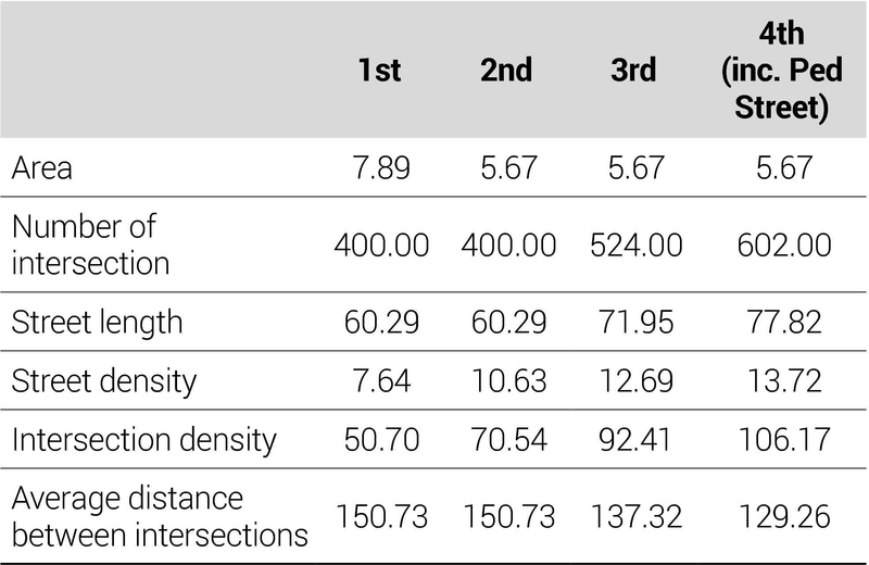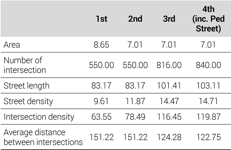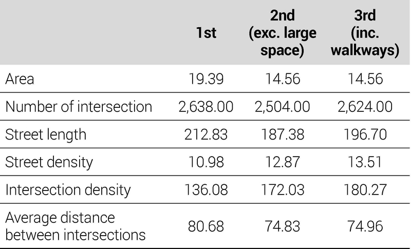 이를 정량적으로 확인하기 위해 아파트 각 동출입을 위한 개별 동선을 제외한 단지 간 연결이 이뤄지는 공공보행 성격의 단지 내 주 보행동선 데이터를 별도로 추출하였다. 그 결과, 가로 밀도와 교차점밀도는 각각 14.40km/km2에서 18.14km/km2로, 교차점밀도 204.14int/km2에서 258.03int/km2로 약 125% 상승하였다.