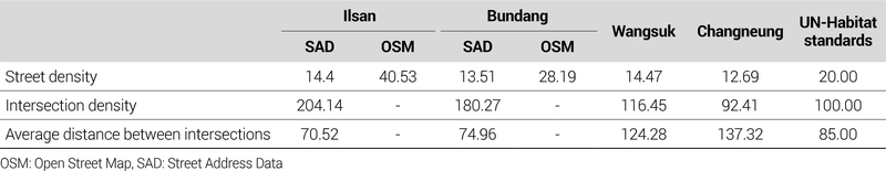 하지만, 도로 외의 보행공간을 고려한 지표에서는 신도시 간 차이가 크게 나타난다. 교차점 밀도에 있어, 1기 신도시는 3기 신도시에 비하여 약 2배로 높은 수치를 보이고 있으며, 고양 창릉은 유엔 해비타트의 최소 기준도 충족하지 못하고 있다. 3기 신도시의 경우 교차점 간 거리가 최대 권고 기준인 85m의 1.5배 이상이 되고 있어 보행과 생활의 공간으로서의 가로 공간이 되지 못하고 있음을 알 수 있다(<Appendix 1> 참조).