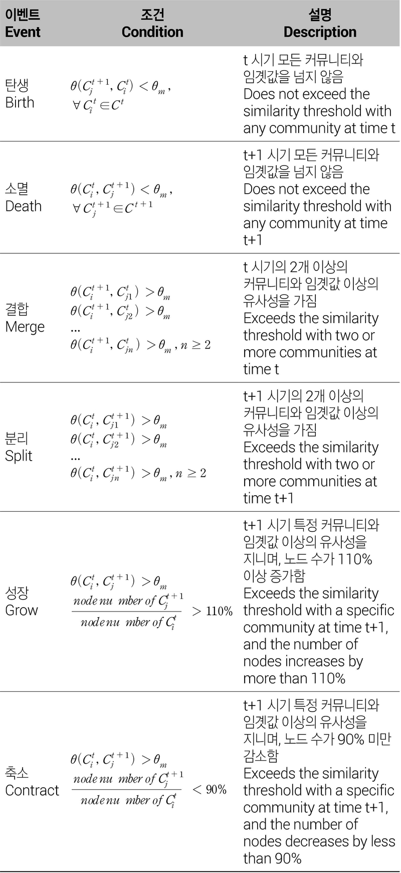 노드의 교집합 대비 노드의 합집합을 기반으로 시간 t에 식별된 커뮤니티 Cit와 시간 t+1에 식별된 커뮤니티 Cjt+1 간 유사성을 계산할 수 있다. 이는 0과 1 사이의 값을 가지며, 커뮤니티의 변화 정도에 따라 1 대 1, 1 대 다, 다 대 다 매칭을 생성할 수 있다. 그 이후, 연구자가 정의한 유사성 임곗값 θm을 기반으로 Palla et al. (2009)이 제시한 범주에 의거 총 여섯 가지 진화 이벤트(evolving events)를 정의한다(표 1).
