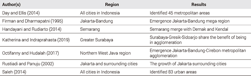 Driven by economic opportunities, numerous studies on urban dynamics in Java emphasize the expansion of metropolitan areas into adjacent cities (see <Table 1>). This expansion has the potential for further growth, potentially leading to the amalgamation of these areas into larger agglomerations (Firman, 2009, 2017; Octifanny and Hudalah, 2017; Pravitasari et al., 2024). However, delineating urban areas using government-assigned urban and metropolitan boundaries often fails to capture the true scale of urban growth (Bosker et al., 2021). These boundaries do not reflect the on-the-ground reality, where cities like Jakarta and Surabaya are increasingly merging with neighboring areas (Firman and Dharmapatni, 1995; Katherina and Indraprahasta, 2019).