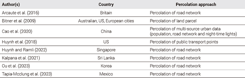 The percolation method has been widely used to analyze urban growth patterns in various countries (see <Table 3>). Tapia-Mcclung et al. (2023) applied percolation theory and fractal dimension analysis to Mexico's national road network to determine city boundaries. They found that the percolated network at the distance of maximum fractal dimension aligns well with actual built-up environmental data. Bitner et al. (2009) investigated the parcel morphology of core cities in Australia, the USA, and Europe, discovering that the morphology of these cities exhibits scaling behavior, reflecting the self-similar hierarchical spatial structure of urban systems. Huynh and Ramli (2022) applied the percolation methodology to Singapore's road network, identifying a critical spatial scale of 85 meters, which corresponds closely with local urban planning boundaries and reveals the city's essential connectivity structure. Kalpana et al. (2021) developed an intersection-based clustered network model (iCN Model) using percolation theory, demonstrating that the derived urban agglomeration pattern matches satellite imagery with over 71% accuracy (KAPPA). Huynh et al. (2018) analyzed the spatial patterns of 53 US cities by examining the distribution of public transport points. They found that these points generally fall into four categories: clustered, scattered, regularly distributed, or a combination thereof. Their findings suggest that urban systems can be classified into two types: well-planned and organically grown. Ou et al. (2023) used percolation on road networks to delineate functional regions in Korea, revealing an extremely Seoul-centered mono-centric structure with greater spatial coverage than conventionally assumed. Cao et al. (2020) proposed a percolation-based method to extract urban areas from multi-source data (population, roads, nighttime lights), validated against Landsat-based reference data in 10 cities, achieving improved accuracy through data fusion (κ= 0.69−0.85, mean κ= 0.78).