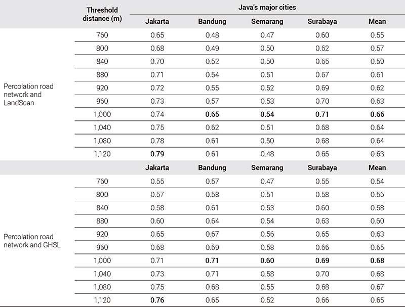 Inspired by Ou et al. (2023), we adapted their methodology for Java, adjusting the distance threshold to account for differences in road network density. To evaluate model accuracy, we compared percolation clusters with population density and built-up area data for the largest clusters using the Jaccard index. Testing various thresholds, we found that the highest similarity occurred at 1,000 meters (see <Table 4>). The mean Jaccard index for four major urban clusters in Java reached 0.66 when comparing LandScan data with percolation road networks, and 0.68 when comparing percolation networks with GHSL data. These results suggest that the spatial distribution of urban areas derived from percolation aligns well with other data sources. This comparison result shows how road connectivity and accessibility relate to geographic and socio-economic factors. <Table 4> presents the overlap results between percolated road networks, LandScan population data, and GHSL data at different thresholds.