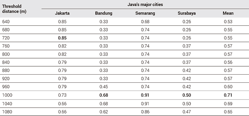Overall, the average Jaccard index for the four main urban clusters in Java identified a peak at the 1000 m threshold (0.71), indicating an overall similarity of 71% at this level of connectivity (Table 5). While for all identified major clusters, the average Jaccard index comparing our results with each reference map ranged from 0.51 compared to Bosker et al. (2021) and 0.56 compared to Day and Ellis (2014). This indicates that road network density effectively represents inter-city commuting patterns and captures the economic extent of large cities. Thus, the percolation-based approach is a suitable alternative for delineating urban clusters, demonstrating a fair level of agreement with traditional flow-based methods.