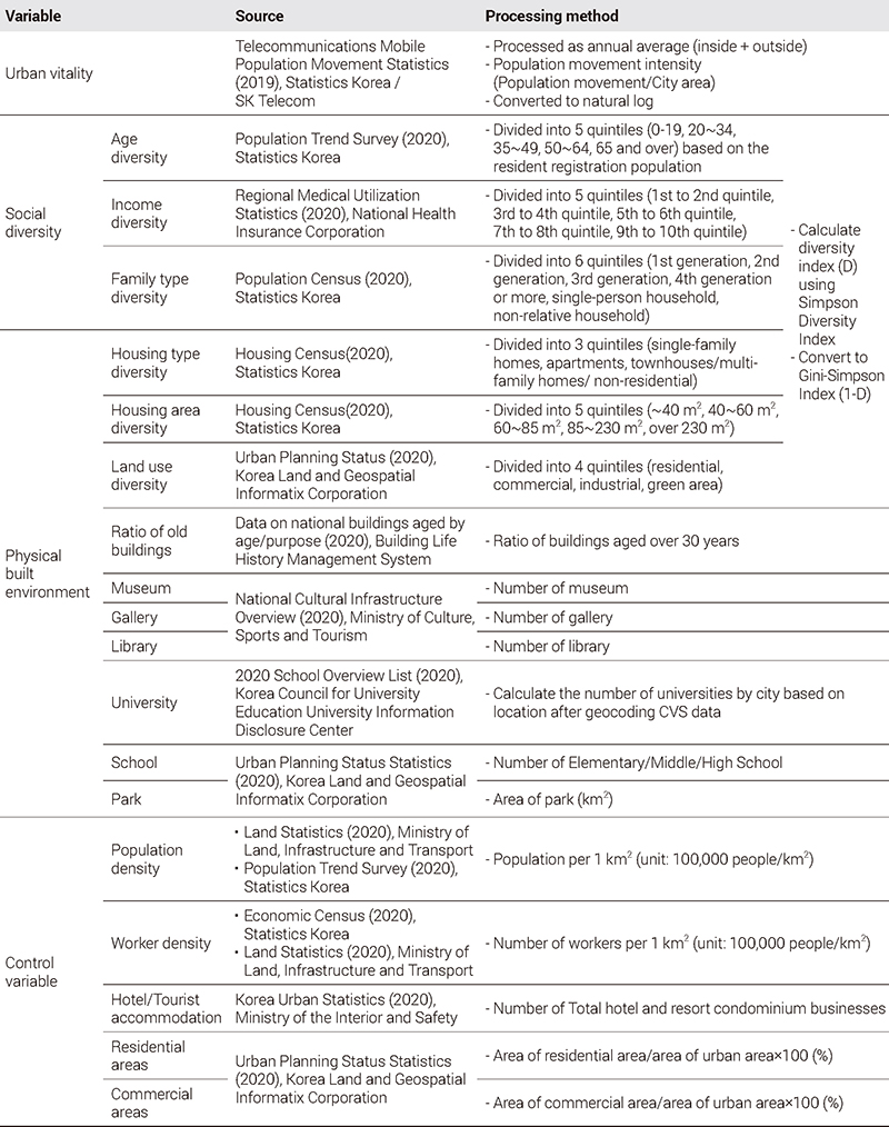 본 연구의 종속변수인 도시 활력은 통계청에서 제공하는 '통신 모바일 인구 이동량 통계' 데이터를 가공하여 사용하였다. 또한 COVID-19로 인한 팬데믹으로 인해 급격한 인구 이동률 감소의 영향이 미치지 않았던 2019년으로 설정하고, 주별로 제공되는 데이터를 연평균 인구 이동량으로 환산하였다. 통계청과 SKT에서 제공하는 인구 이동량 데이터는 행정동 간 이동을 인구 이동으로 정의하고 있으며, 본인이 실거주하는 시군구 내 행정동을 기준으로 관외, 관내 이동량(건수)을 측정한다. 거주지는 한 달 동안 오전 0시~6시 사이 가장 오랜 시간 체류한 기지국의 위치를 기준으로 인식되고, 거주지 외 타 시군구의 행정동을 방문하여 30분 이상 체류한 경우는 관외 이동으로 집계되며, 거주지의 시군구 내 행정동을 방문하여 30분 이상 체류한 경우는 관내 이동으로 집계하고, 이동량 전수화 과정을 통해 SKT 가입자의 성, 연령, 지역 비율의 가중치를 적용하여 지역 전체의 통계량을 추정한다. 데이터는 1주 단위로 측정되어 있으나, 인구 이동량은 평일/주말, 오전/오후, 사계절과 같은 시간적, 환경적 요인이나 콘서트, 축제 등 특정 행사와 같은 특수성의 영향이 크기 때문에 본 연구에서는 연평균 인구 이동량으로 환산하여 분석에 활용하였다. 또한 본 연구에서 도시 활력은 거주자와 외부인을 구분하지 않고, 도시 자체에서 발생되는 인구 이동량을 측정하고자 하였기 때문에 관외, 관내 이동을 합산한 총인구 이동량을 분석에 투입하였다.