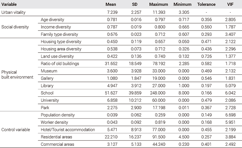 또한 도시 활력과 사회적 다양성에 관한 선행연구에 의하면, 인구 밀도와 산업 활성화 정도, 관광 관련 시설의 수, 주거지역 및 상업지역의 비율과 도시 활력, 사회적 다양성 간에는 유의미한 상관관계가 존재한다. 이에 본 연구에서는 통제변수로 인구 밀도와 종사자 밀도, 호텔 및 관광 숙박 시설의 수, 주거지역 및 상업지역의 비율을 통제변수로 설정하여 사회적 다양성과 도시 활력 간의 관계를 보다 명확히 추정하고자 하였다(Table 1).