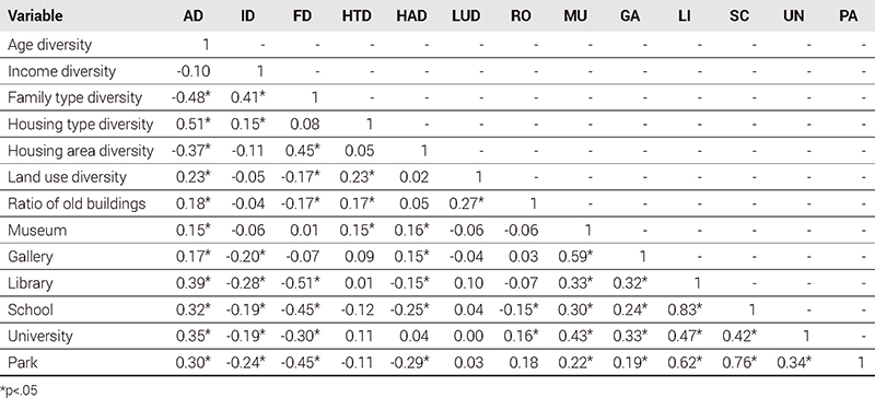 다수의 선행연구에서 사회적 다양성과 물리적 건조 환경의 긍정적인 상관관계와 중요성에 대해 언급하고 있기 때문에, 본 분석의 결과에서도 영향을 미칠 수 있다. 따라서 본 분석에 앞서 피어슨 상관 분석(Pearson Correlation Analysis)을 활용하여 사회적 다양성과 물리적 건조 환경 간 관계를 확인하고, 분석 결과의 해석에 참고하고자 하였다. 분석 결과, 연령 다양성은 모든 물리적 건조 환경 변수와 통계적으로 유의미한 상관관계를 가지고 있으며, 주택 면적 다양성을 제외한 모든 변수들과 양의 상관관계를 나타낸다. 이는 연령 다양성이 물리적 건조 환경과 밀접하게 연관되어 있고, 물리적 건조 환경의 변화에 가장 민감할 수 있다는 가능성을 시사한다. 소득 다양성은 선행연구와 달리 주택 유형, 면적 다양성과 유의미한 상관관계를 나타내지 않았으며, 미술관, 도서관, 학교, 대학, 공원과 약한 음의 상관관계를 가지고 있는 것으로 나타났다. 이는 소득 다양성이 낮은 지역에 도서관, 공원과 같은 사회 기반시설이 더 많이 입지해 있다는 것으로 해석할 수 있다. 가구 형태 다양성은 주택 면적 다양성과 높은 양의 상관관계를 나타내고, 도서관, 학교, 공원 등과는 높은 음의 상관관계를 나타내어 연령 다양성과 다소 상반되는 결과가 도출되었다(Table 3).