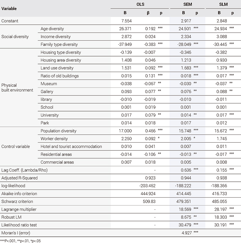 다음으로 GeoDa를 사용하여 사회적 다양성과 물리적 건조 환경이 도시 활력에 미치는 영향에 대한 회귀분석과 공간회귀분석을 수행하였다. 최종 모형을 선정하기 위해 도시 활력을 종속변수로 일반적인 회귀모형(OLS)과 공간시차모형(SLM), 공간오차모형(SEM)을 수행한 후, 3개 모형 결괏값의 log-likelihood와 AIC(Akaike Info Criterion)와 SC(Schwarz Criterion)값을 비교하여 log-likelihood의 값이 가장 높고, AIC와 SC값이 더 낮은 모형을 각 모델의 최종 모형으로 채택하였다. 또한, 공간회귀모형의 R-squared는 OLS 모형에서 최소제곱법(ordinary least suqares estimation)에 의해 추정되는 R-squared 값과 달리 최대 우도 추정법(maximum likelihood estimation)에 의해 산출되기 때문에, R-Squared값보다는 log-likelihood, AIC와 SC값을 기준으로 판단하였다(Table 4).