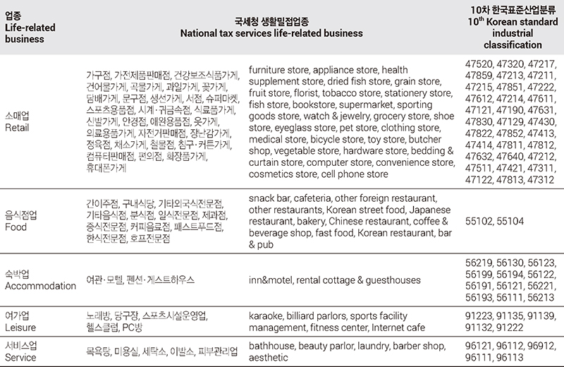 본 연구의 대상은 국세청 100대 생활밀접업종에서 소매·음식점업·숙박업·여가업·서비스업에 해당하는 54개 업종을 선택한 후, 이를 10차 한국표준산업분류를 기준으로 분류한 자영업자이다. 단, 서울시 사업체조사와 국세청API를 활용하기 때문에 업력 2년 이상의 자영업자로 한정한다. 둘째, 공간적 범위는 서울시이며, 서울시 우리마을가게 상권분석서비스에서 제공하는 전통시장상권(이하 전통시장), 발달상권, 골목상권, 관광특구 등 상권영역을 활용하였다. 셋째, 시간적 범위는 2019년 7월부터 2021년 12월까지 30개월이다. 사회적 거리두기는 2022년 4월 18일부로 전면 해제되었으나, 2020년 이후 서울시사업체조사에서 별도의 사업장이 없는 사업체가가 조사대상에 포함되었고, 이에 대한 원자료 구득이 어려웠기 때문이다.