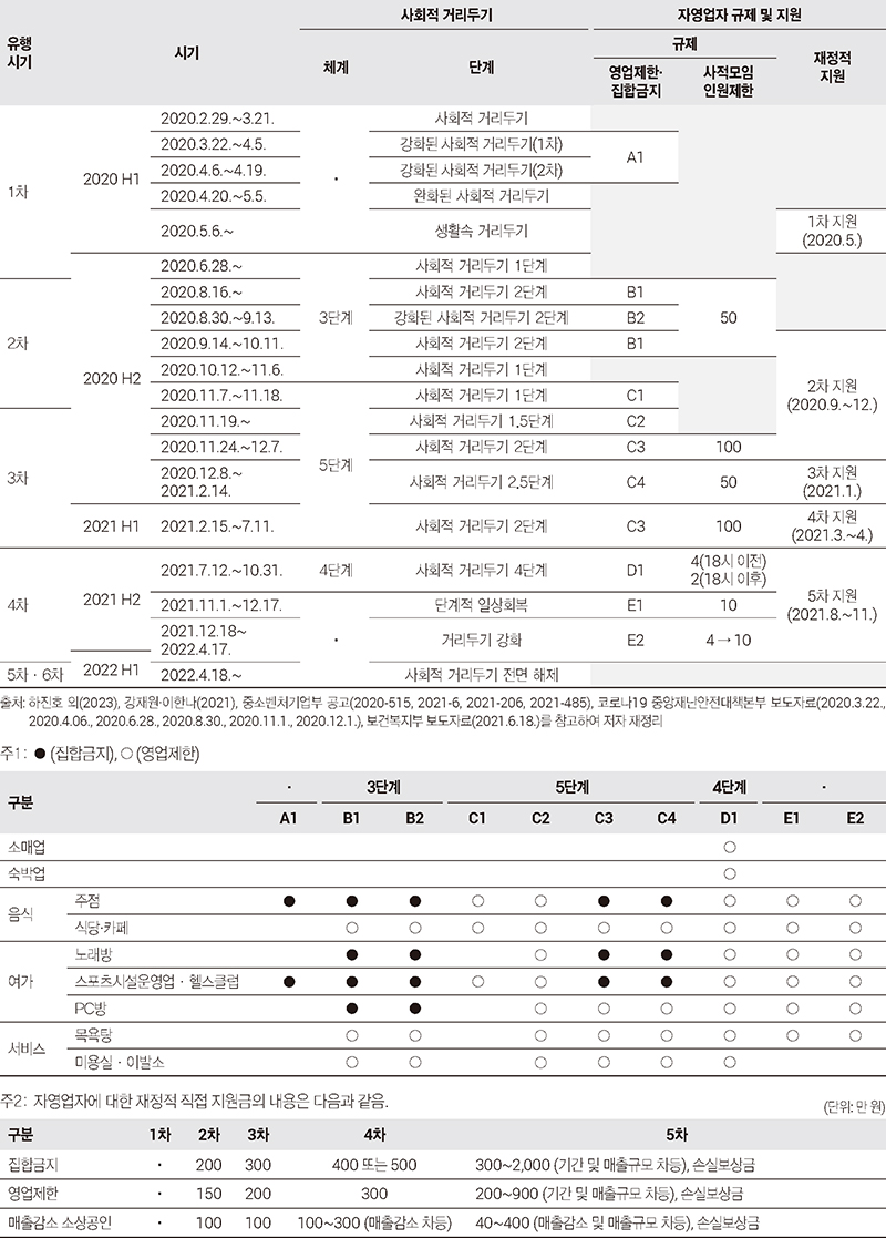 2020년 상반기는 처음으로 사회적 거리두기를 시작하였고, 정부는 2020년 3월 22일부터 4월 19일까지 주점(유흥시설 등)과 헬스클럽(실내 체육시설)에 대해 집합금지 명령을 시행하였다. 한편, 정부는 2020년 5월 4일 국민의 생계 안정과 민간 소비 촉진을 위해 긴급재난지원금을 발표하며, 전 국민을 대상으로 40~100만 원을 차등 지급하였다. 2020년 하반기는 사회적 거리두기가 3단계로 도입(2020년 6월 28일)되었고, 2020년 8월 16일부터 10월 11일까지 2단계가 적용되었다. 2차 유행은 다중이용시설을 중심으로 수도권의 집단감염이 확산된 시기로, 주점·노래방·헬스클럽·PC방 등 업종에서 집합금지가 시행되었으며, 이 밖의 업종은 4㎡당 1명 수용 등 시설의 이용 인원에 제한을 두었다. 한편, 실내 50인 이상 사적 모임이 제한되는 행정명령이 시행되었다. 2020년 11월 1일 사회적 거리두기는 5단계로 개편되었으며, 코로나19 변이 바이러스가 나타난 3차 유행 시기에 수도권은 2020년 11월부터 2단계로 상향된 후 다시 2.5단계로 상향해 2021년 2월 14일까지 유지되었다. 당시 대부분 업종이 영업제한 조치를 받았으며, 주점·노래방·헬스클럽은 집합금지가 시행되었다. 한편, 2020년 9월 2차 지원인 「소상공인 새희망자금」으로 집합금지·영업제한·매출감소 소상공인 유형별로 정액의 지원금이 지급되었다. 2021년 상반기는 사회적 거리두기 2단계가 유지되며, 자영업자 규제가 지속되었고, 3차 지원 「소상공인 버팀목자금」(2021.1.6.)과 4차 지원 「소상공인 버팀목자금 플러스」(2021.3.29.)가 시행되었다. 정액의 지원금이 지급된 3차 지원과 달리 4차에서는 매출 감소에 따라 지원금이 차등 지급되었다.