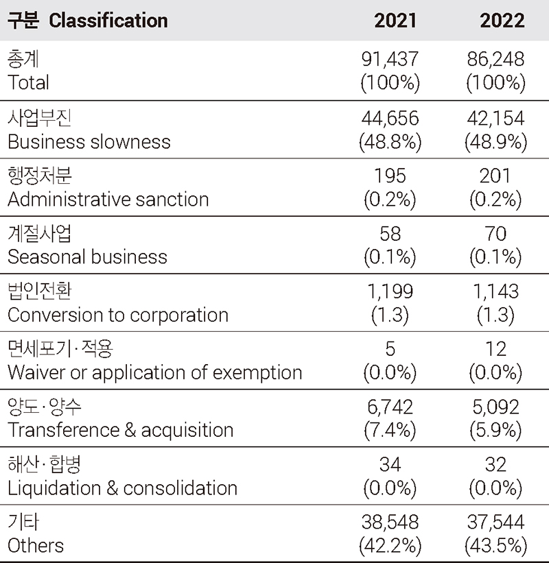 폐업은 ‘사업자가 해당 영업을 계속할 의사가 없어 영업활동을 영구적으로 종료하는 것’을 말한다(국세청, 2020). 폐업은 사업자 생애주기의 최종 단계로, 사업자 등록을 말소하고 영업을 종료하는 행위를 의미한다. 일반적으로 자영업자의 폐업은 임대차 해지 통보, 양수인 확보, 종업원 정리, 4대 보험 탈퇴, 집기·기기 처리, 자산정리, 사업 정리 컨설팅, 철거·원상복구, 임대보증금 회수, 공공요금 정산, 폐업 신고, 세무 정산 등 절차로 이뤄진다(강종헌, 2020). 국세청에서는 일반사업자의 폐업 사유를 사업부진, 양도·양수 등 8가지로 구분하고 있으며, 2022년 기준 서울시 일반사업자 폐업 사유는 사업부진 48.9%, 기타 43.5%, 양도·양수 5.9% 순이다(표 1). 이때, 기타는 ‘폐업사실을 신고하지 아니하여 폐업 사유를 알 수 없는 경우’로, 사업자가 폐업한 이후 폐업신고를 하지 않아 관할세무서에서 사업의 계속여부와 사업장 유지 및 관리상태를 판단해 사업자등록을 말소한 ‘직권폐업’이라고 볼 수 있다. 즉, 양도·양수 및 법인전환의 비중이 10% 미만인 점을 볼 때, 일반사업자 폐업 사유의 대부분은 사업부진이다.