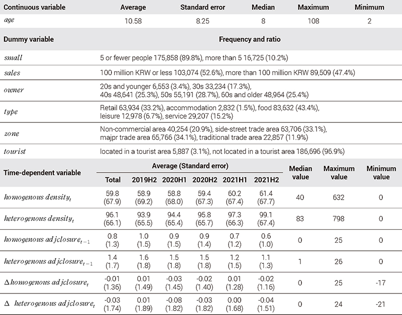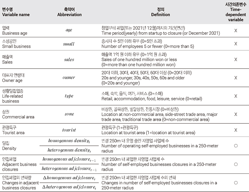 독립변수는 업력, 소상공인 여부, 매출액(규모), 대표자 연령대, 업종, 상권 등 일반적 요인과 인접 폐업 및 인접폐업의 변화량으로 구성된다(표 2). 먼저, 업력은 경험 축적 및 단골 확보 등 노하우(know-how)를 나타내는 변수로(남윤미, 2017), 창업연월로부터 폐업시점 혹은 2021년 12월까지의 기간을 연단위로 산출한다. 소상공인 여부는 「중소기업기본법」 제2조에 따라 종사자 수 5인 이하 유무를, 매출액(규모)은 연간 매출액 1억 원 이하 유무를 의미한다. 대표자 연령대는 코로나19 이후 자영업자에게 발생한 비대면·디지털전환에 대한 대응이 연령대별로 다르게 나타나는지 확인하기 위한 변수다. 20대 이하, 30대, 40대, 50대, 60대 이상 등 5가지로 구분하였으며, 20대 이하를 기준값으로 설정하였다. 한편, 업종은 사회적 거리두기 등 정책에 의한 업종 간 차이를 확인하며, 소매, 숙박, 음식, 여가, 서비스 등 5가지로 구분하였다(부록 표 1). 상권은 서울시상권분석서비스에서 정의한 서울의 상권정의를 사용하였다. 먼저, 골목상권은 점포 밀집도가 높은 상권으로, 대로변이 아닌 거주지 안의 좁은 도로를 따라 형성된 상권을 말한다. 한편, 발달상권은 배후지를 고려하지 않은 도보이동이 가능한 범위 내의 상가업소밀집지역을 의미하며, 대표적으로 서울역, 강남역, 종각역 등 유동인구가 높은 지하철역을 중심으로 형성되어 있다. 전통시장은 오랜 기간에 걸쳐 일정한 지역에 자연발생적으로 형성된 상설·정기시장으로 평화시장·풍납시장 등이 해당한다. 따라서 상권 변수는 비상권을 기저 범주로 정의한 후, 골목·발달·전통시장으로 범주화한 더미변수를 의미한다. 한편, 관광특구는 관광활동이 이뤄지는 지역 내 상권으로 2020년 기준 6개(이태원, 명동 등, 동대문패션타운, 종로·청계, 잠실, 강남마이스)가 지정되어 있다. 골목·발달·전통시장은 서로 공간적으로 배타적인 관계이지만, 관광특구는 각 상권과 중첩되어 지정될 수 있다. 따라서 상권 변수와 달리 별도 변수로 모형에 반영하였다. 자영업 생존기간에 영향을 미치는 일반적 요인은 시간(월)에 따라 변하지 않는 변수다.