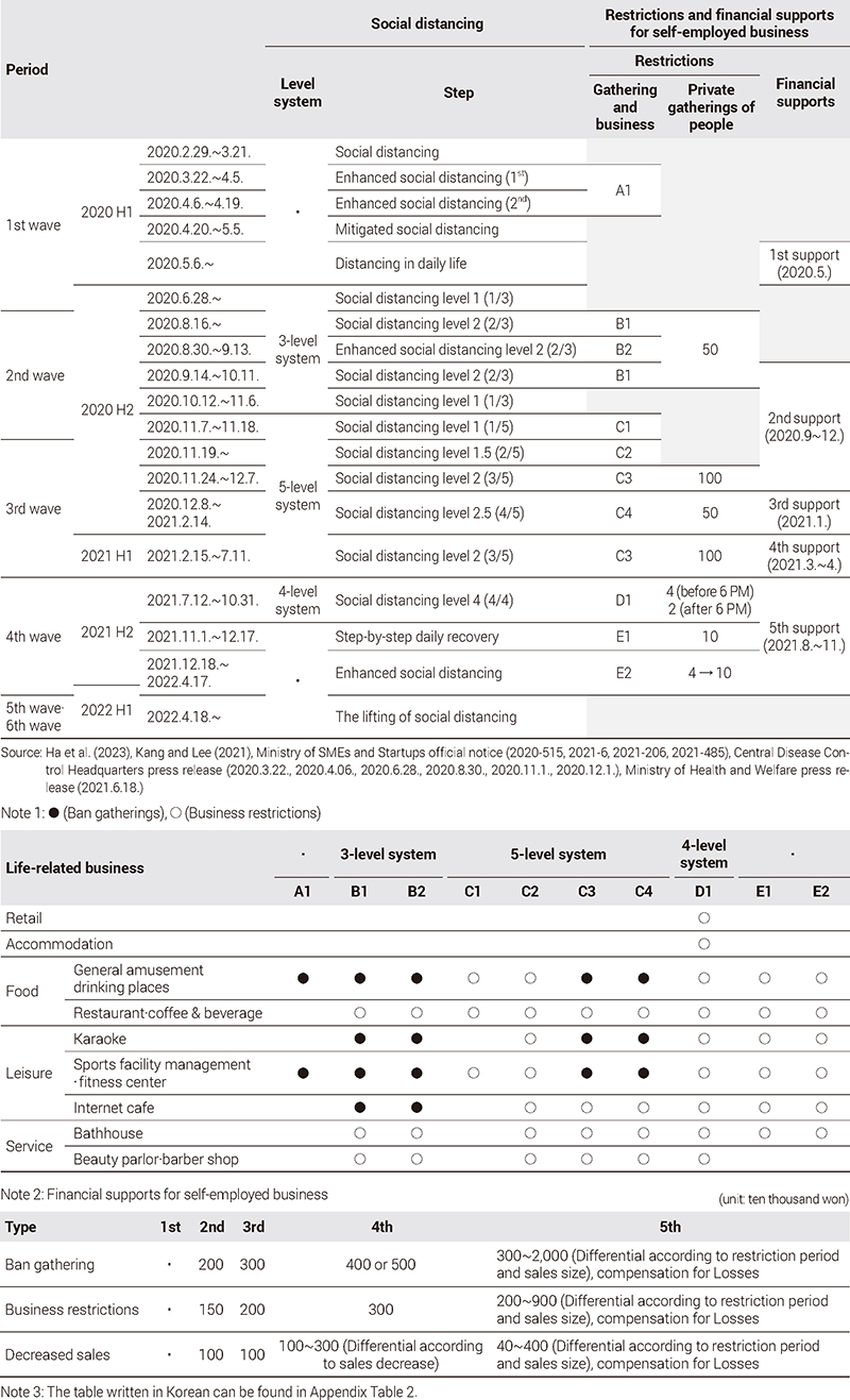 사회적 거리두기에 의한 자영업자에 대한 집합금지와 영업제한은 2020년 하반기부터 2021년 하반기까지 지속되었다. 특히, 4단계 체계가 도입되기까지 주점·노래방·헬스클럽 등 일부 업종은 집합금지를 지속적으로 적용받았다. 한편, 자영업자에 대한 규제가 지속됨에 따라, 정부가 직접 지원하는 규모는 계속해서 증가했다. 2·3·4차 지원의 지원금은 비슷하였으나, 5차는 매출규모와 집합금지·영업제한 기간 및 매출감소를 고려해 더 큰 지원금을 차등지급하였고, 손실보상금도 시행되었다. 단, 모든 지원 대상에서 폐업한 자영업자는 제외되었는데, 정부의 지원규모가 커짐에 따라 행정적 폐업에 대한 유인이 작아질 수 있음을 유추할 수 있다.