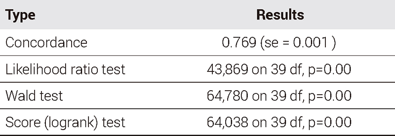 모델 통계량을 살펴보면, 우도비, 왈드, 스코어 검정의 p-value가 0.05보다 작아, 모든 독립변수의 계수가 0이라는 귀무가설을 기각한다. Concordance index는 생존분석의 성능을 평가하는 지표로, 0.5는 무작위를, 1에 가까울수록 정확하게 예측한다고 볼 수 있으며, 그 값은 0.769를 보였다(표 5).