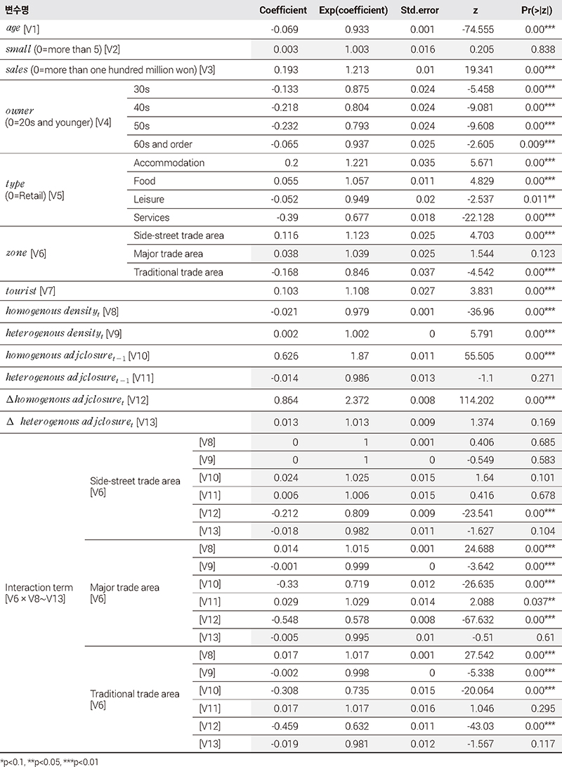 한편, 밀집·인접폐업·인접폐업의 변화량 변수가 위험률에 미치는 영향이 상권별로 차이가 있음을 가정하여 상권 변수와의 상호작용항을 모형에 반영하였다. 따라서, 밀집·인접폐업·인접폐업의 변화량 변수는 비상권에서의 계수를 의미하며, 상호작용항이 통계적으로 유의할 경우, 골목상권·발달상권·전통시장 등 상권유형별로 밀집·인접폐업·인접폐업의 변화량 변수가 미치는 영향이 비상권의 계수와 차이를 보이게 된다. 이를 통해, 상권유형에 따라 밀집·인접폐업·인접폐업의 변화량 변수가 위험률에 미치는 영향의 차이가 있음을 확인하고자 하였다.
